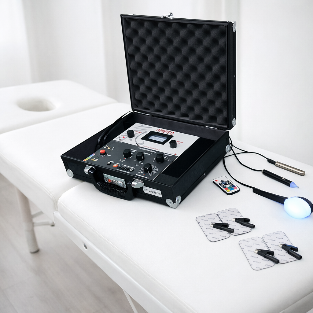 Reposant sur une synergie technologique associant électrostimulation douce, chromothérapie, magnétothérapie et fréquences relaxantes, la méthode AMATO s’inspire des principes énergétiques issus de la tradition chinoise, intégrés dans une approche moderne et structurée du bien-être.